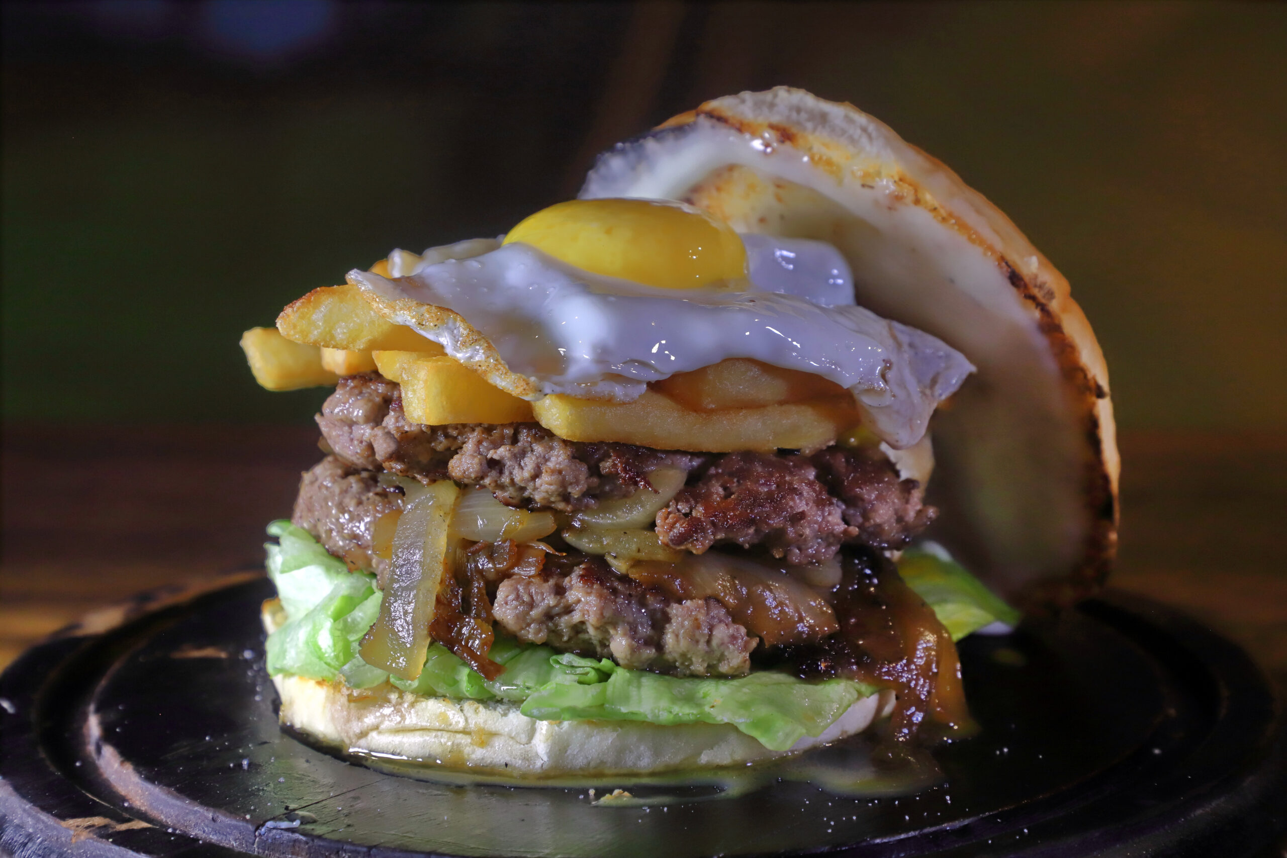 Doble hamburguesa de 250 g, en pan de hamburguesa, más papas fritas, cebolla caramelizada, huevo frito un toque de lechuga y mayo de la casa.