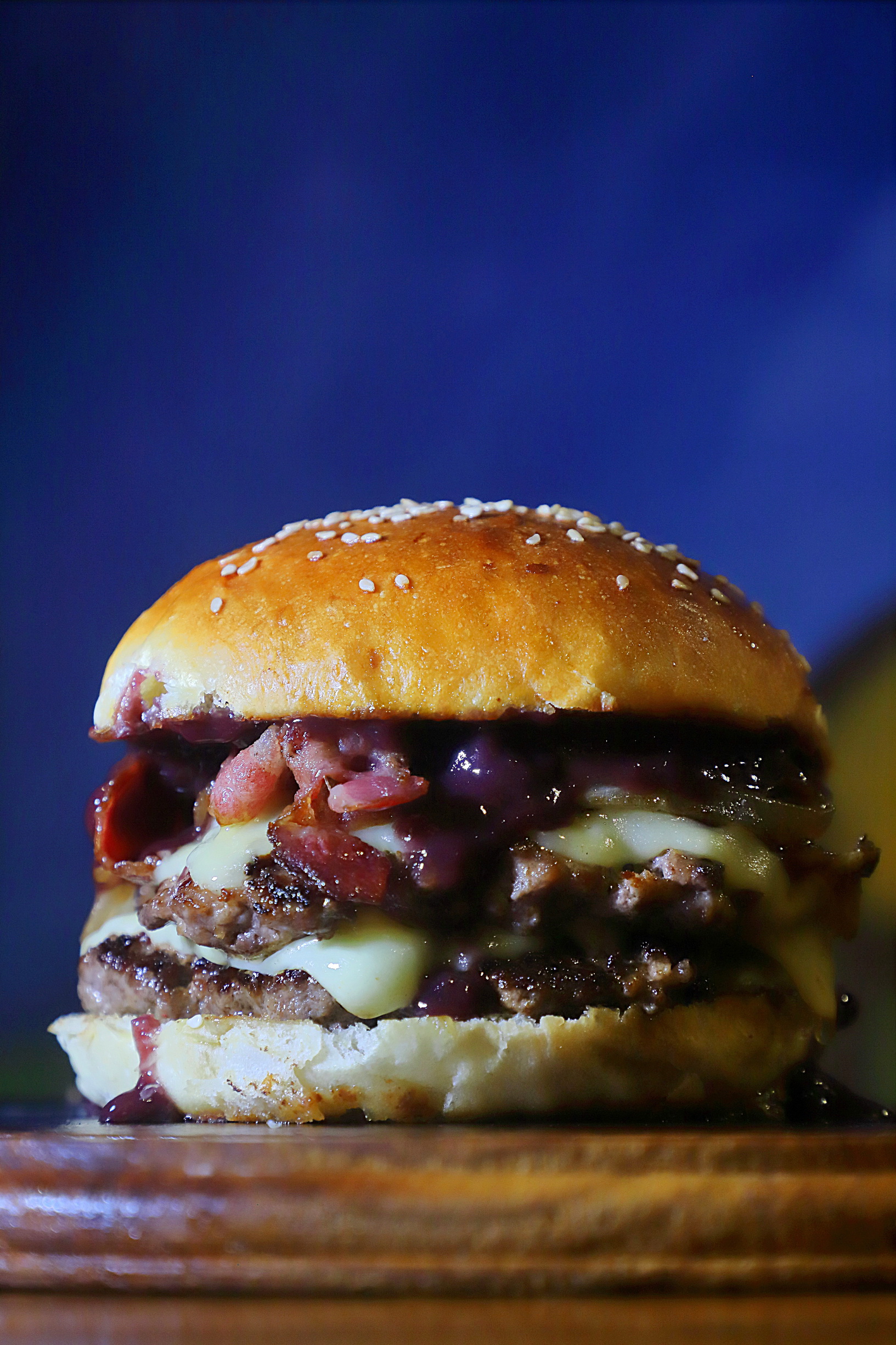 Pan de hamburguesa, doble hamburguesa de 250 g cada una, con queso fundido, tocino crocante, un toque de cebolla frita y una salsa al vino tinto que lo unta todo.
