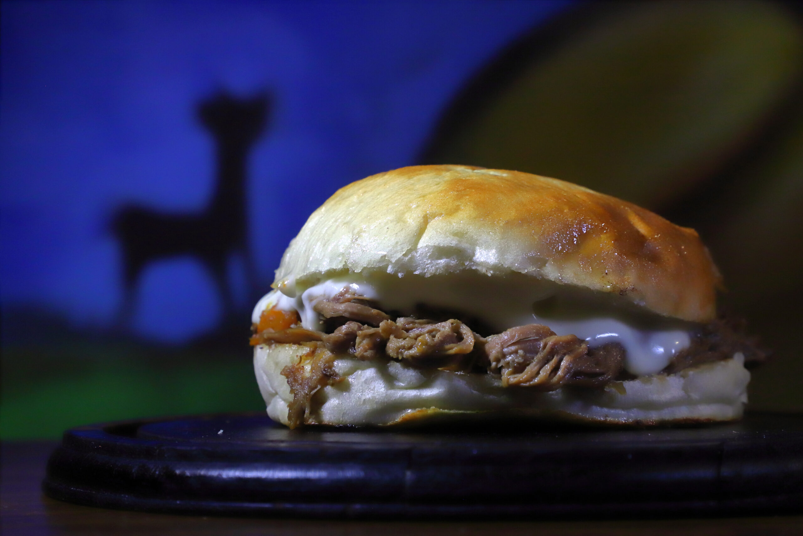 Pan amasado, harto queso, harta palta, mayo de la casa.